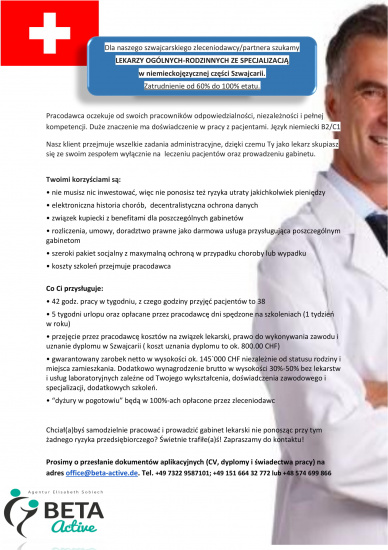 Dla naszego szwajcarskiego zleceniodawcy/partnera szukamy Lekarzy ogólnych-rodzinnych ze specjalizacją w niemieckojęzycznej części Szwajcarii. Zatrudnienie od 60% do 100%