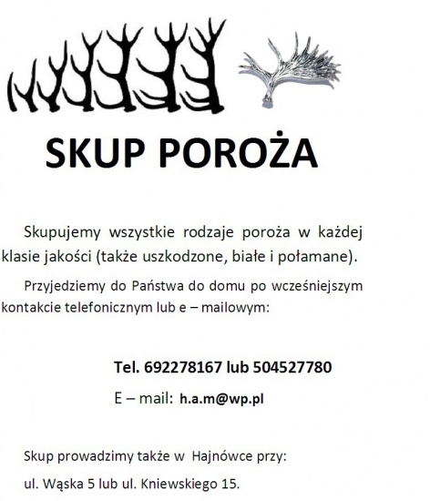 Skupujemy wszystkie rodzaje poroża (połamane, pocięte, polakierowane, zielone białe, scinki itp.) Przyjeżdżamy do klienta i płacimy gotówką.